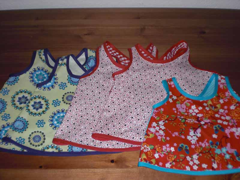 Eines Tages beschloss die Frau fünf besondere Schürzen für fünf besondere kleine Mädchen zu nähen…nämlich den Freundinnen ihres besonderen Töchterchens. Eine willkommene Gelegenheit noch mehr zu üben und sich noch mehr über ihre zänkerische Nähmaschine zu ärgern.