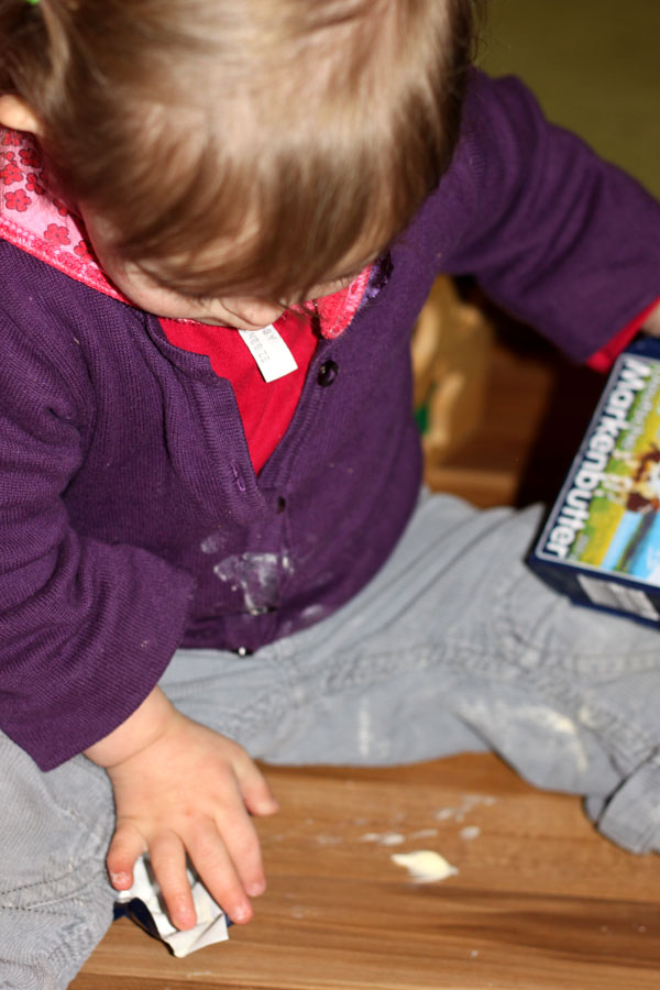 Da saß ich dann und habe gerade ganz genüsslich in ein Paket Butter reingebissen, das Mama vergessen hatte wegzuräumen…