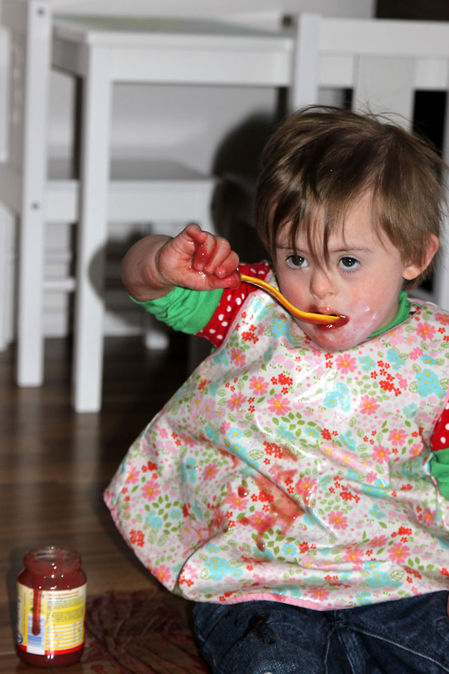 Mir beim Essen helfen lassen, tue ich nur unter lautem Protest und noch lauteren Geschrei…und es ist ja nicht so, dass man mir nicht beigebracht hat, dass man beim Essen am Tisch sitzt…aber manchmal ist VOR dem Tisch sitzen einfach bequemer!