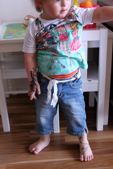 Schick siehste aus! Ich kenn das hier außer mit Stiften auch noch mit Stempeln. Seit dem Puppentheater im Kiga werden immer ordentlich die Hände bestempelt. Ganz toll sind auch diverse Schminkkästchen von der großen Schwester. 😉 Aber lieber schminken, malen und stempeln, als sich selber die Haare schneiden.