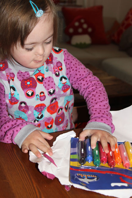 Laurin findet Puzzle ziemlich d..f, aber vielleicht kommt das ja noch. Er malt nun seid neusten, am liebsten auf den Tisch. Badewannenkreiden sind echt was feines!