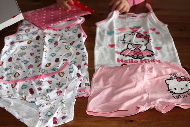 Hab ich doch gestern erst gesagt, dass es ganz bestimmt bald wieder was für Dich und Deinen Kleiderschrank gibt – hihihi. Und wusste ich doch auch, dass Deine Mama "total" auf das Kätzchen abfährt. Aber egal, Du musst ähm darfst es ja tragen :o) Und wenn Du jetzt fleißig beim Toilettentraining bist, kann man wirklich nie genug Unterwäsche haben (weiß ich hier gerade auch aus Erfahrung ;o).