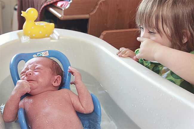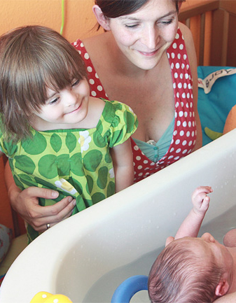 …ist ein schönes Bad genau das Richtige! Deshalb war heute auch der erste Badetag für Vincent. Und ich durfte unserer Hebamme helfen meinen Bruder zu baden.