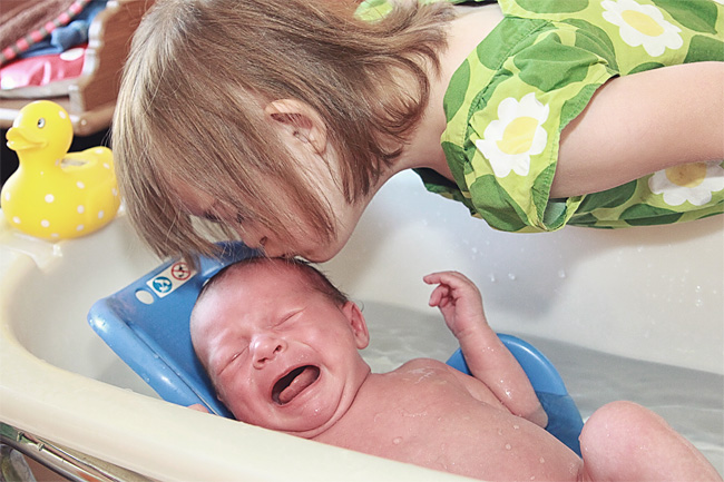 Godt forstå lille Vincent blev træt efter at være badet 1.gang det må også være lidt skræmmende. Men sikke sød storesøster trøster – dejligt foto