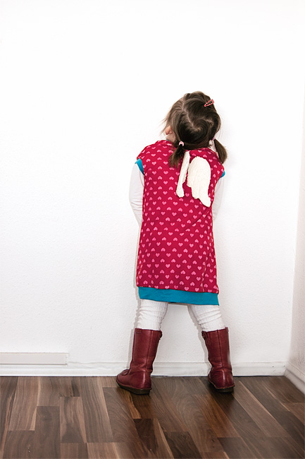 Und Papa gefällt es trotzdem. Mir auch! Ich wollte schon lange kein Kleidungsstück so schnell und freiwillig anziehen, wie mein neues Kleidchen. Und dann bin ich erstmal eine Runde im Kreis getanzt. Die Message kam bei meiner Mama an „Ich bin ein Mädchen. Mädchen lieben Kleider. Und Mama muss mehr Kleider für mich nähen“. Die Flügel sind aus dem tollen Hilco Plüsch und verstärkt mit einem festen Vlies.