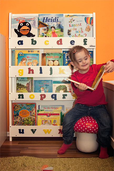 Seit ein paar Tagen habe ich ein wunderschönes Bücherregal, das all die gewünschten Kriterien erfüllt und auch noch so platzsparend ist, das es hinter meine geöffnete Zimmertür passt. Toll! Man kann die Titelseiten der Bücher direkt sehen, was die Auswahl leichter macht. Nicht, dass ich meine Bücher nicht direkt am Buchrücken erkennen würde, aber Mama tut sich da schon mal schwer. Außerdem ist es sehr robust und gut verarbeitet. Und es lässt sich auch ohne Ingenieur-Studium schnell und einfach zusammenbauen.