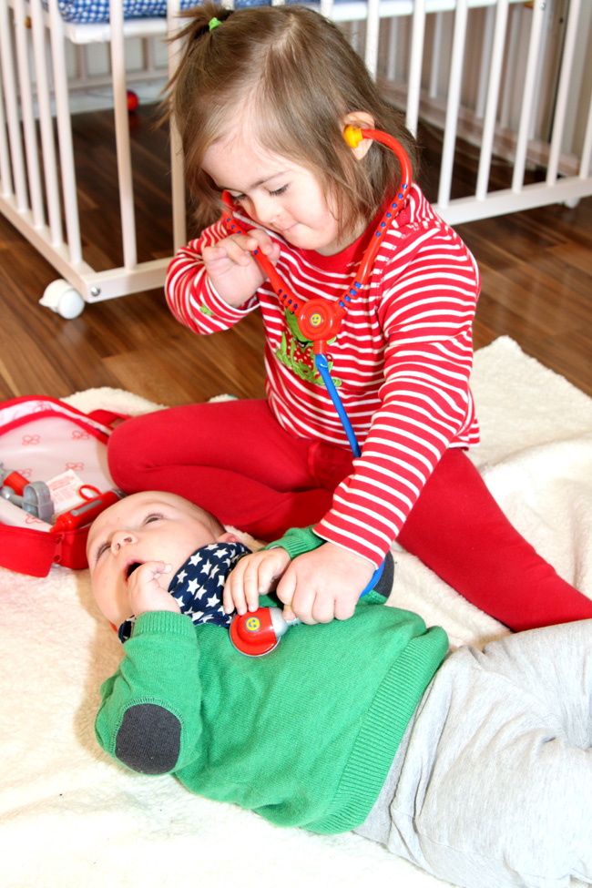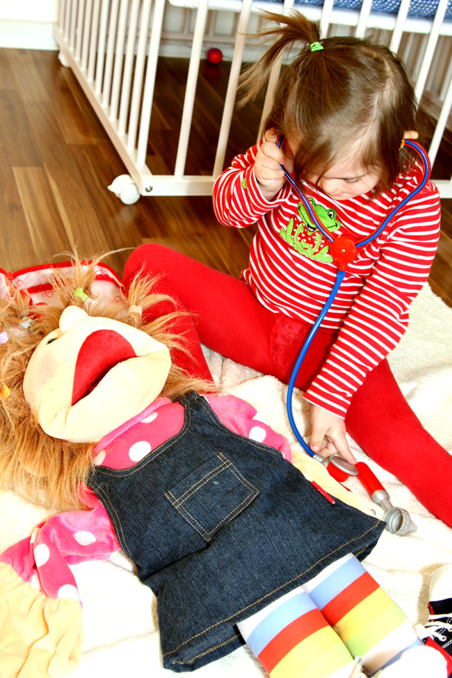 Ich lach mich kaputt! Der geklaute Dr. Titel – da werd ich in Zukunft immer an Dich denken, süße Maus! Deine Herzensschwester hat auch einen Doktor-Koffer zu Weihnachten bekommen, aber aus pädagogisch wertvollem Holzspielzeug… Irgendwie ist Deiner viel realer… Das wird bei uns so enden, dass wir alle wichtigen Instrumente nochmal in spielbar kaufen werden:-)))