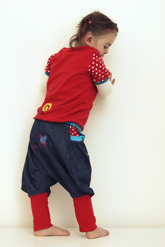 Das ist eine wirklich sehr süße Umsetzung vom Schnitt und Deine Maus sieht so aus, als würde sie die Hose tatsächlich sehr gerne tragen *g*. Bei uns kommen ja "leider" auch fast nur noch Kleider in den Schrank. Hosen tragen zu müssen ist bei uns quasi die Höchststrafe….hach können wir Eltern fies sein *g*.