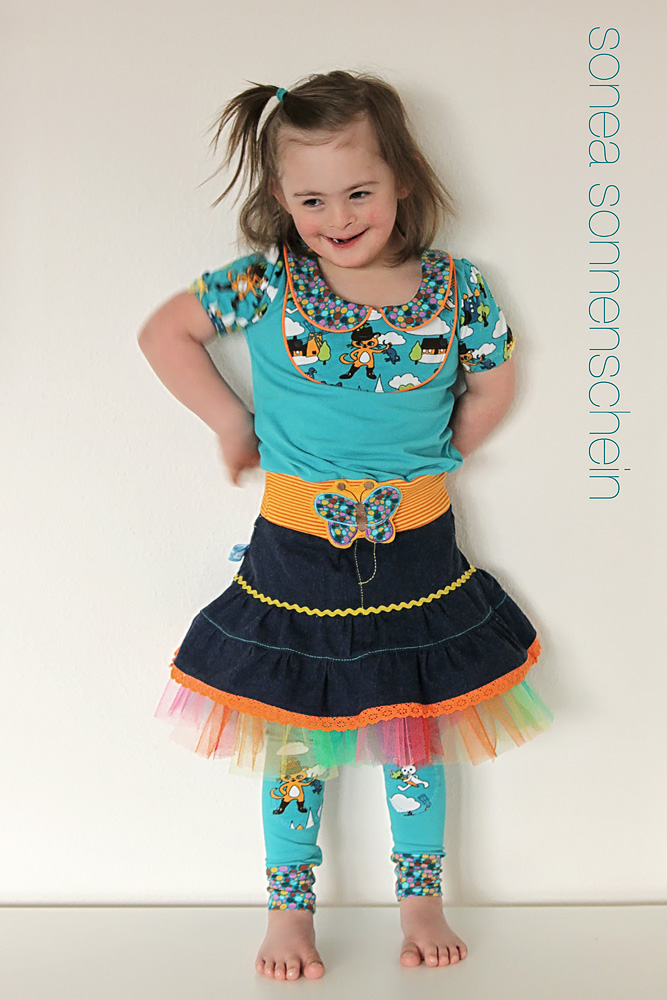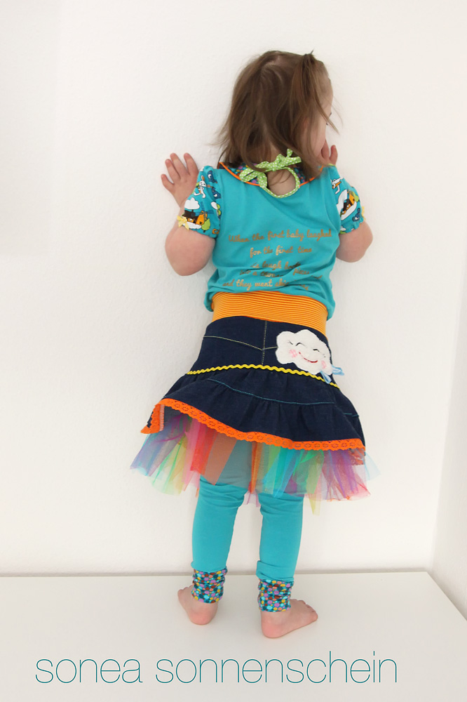 Puffärmchen, der Lina-Halsausschnitt, so dass die Stoffe nochmal besser zur Geltung kommen, eine Leggins für drunter und ein Regenbogen-Tutu!