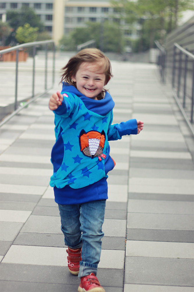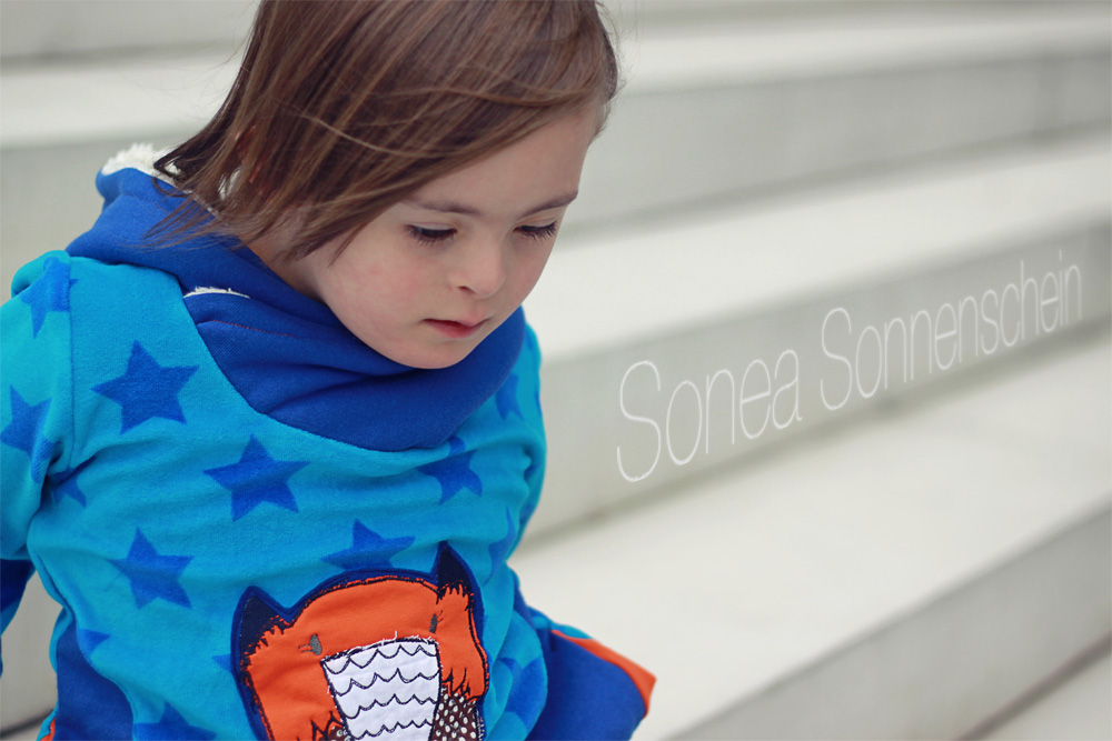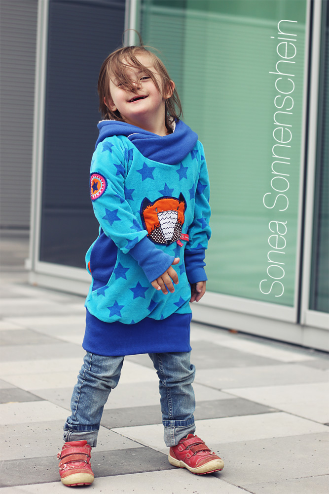Nicht nur ich bin total verliebt in diesen Schnitt, sondern auch mein kleiner Sonnenschein. Sonea hat mir den Hoodie direkt mit funkelnden Augen aus der Hand gerissen, als ich ihn fertig genäht habe „Mir! Meine Pullover!“… nur damit ich nicht auf die Idee komme, ihn selbst anziehen zu wollen. Zugegeben, wäre er mir nicht viel zu klein, wäre das nicht ganz so abwägig, denn ich liebe diesen Schnitt und dass ein Mama-Hoodie auch noch her muss, ist doch wohl klar… Sonnenklar sogar.